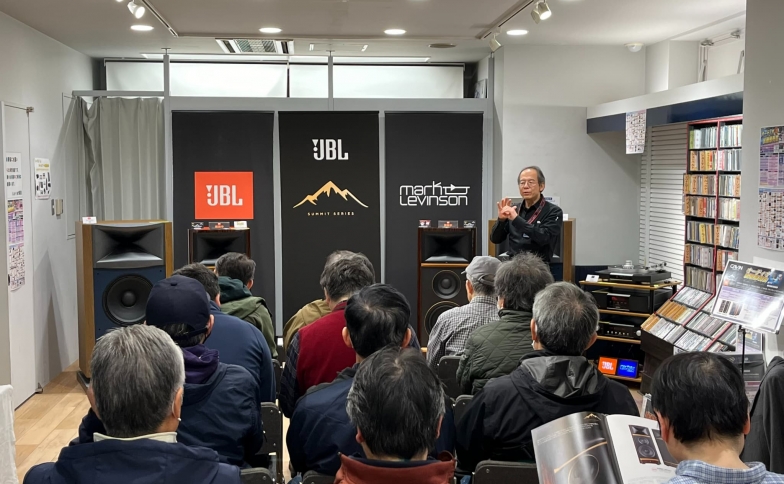 38㎝ウーハーを搭載したJBL(ジェービーエル)のフロア型スピーカー『PROJECT K2 S9900』を主役に、レコード・SACDの試聴を実施。システムは全てマークレビンソンの『No5000シリーズ』(モノラルパワーアンプ『No5302』、アナログプレーヤー『No5105』、プリアンプ『No5206』、SACDプレーヤー『No5206』)で統一されておりました!