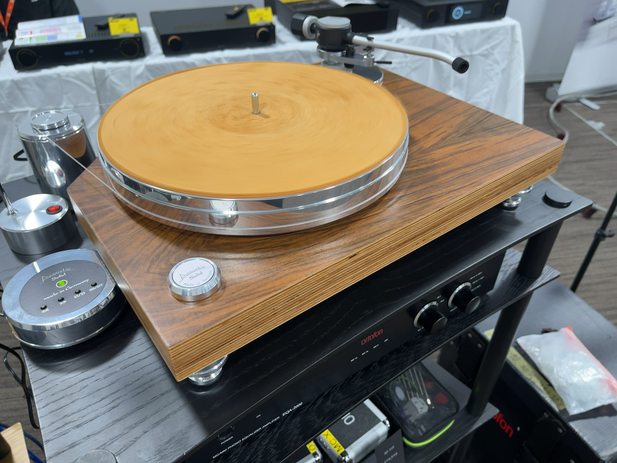 ortofon(オルトフォン)では、MC Qシリーズの生産完了に伴って発売された新モデル“MC Xシリーズ”全モデルを比較するデモを実施。「全モデルを比較試聴」という贅沢が出来るのは試聴会ならでは。使用されたアナログプレーヤーは木目が美しい ACOUSTIC SOLID (アコースティックソリッド)『solid classic wood MPX』、フォノイコライザーはortofon『EQA-2000』でした。