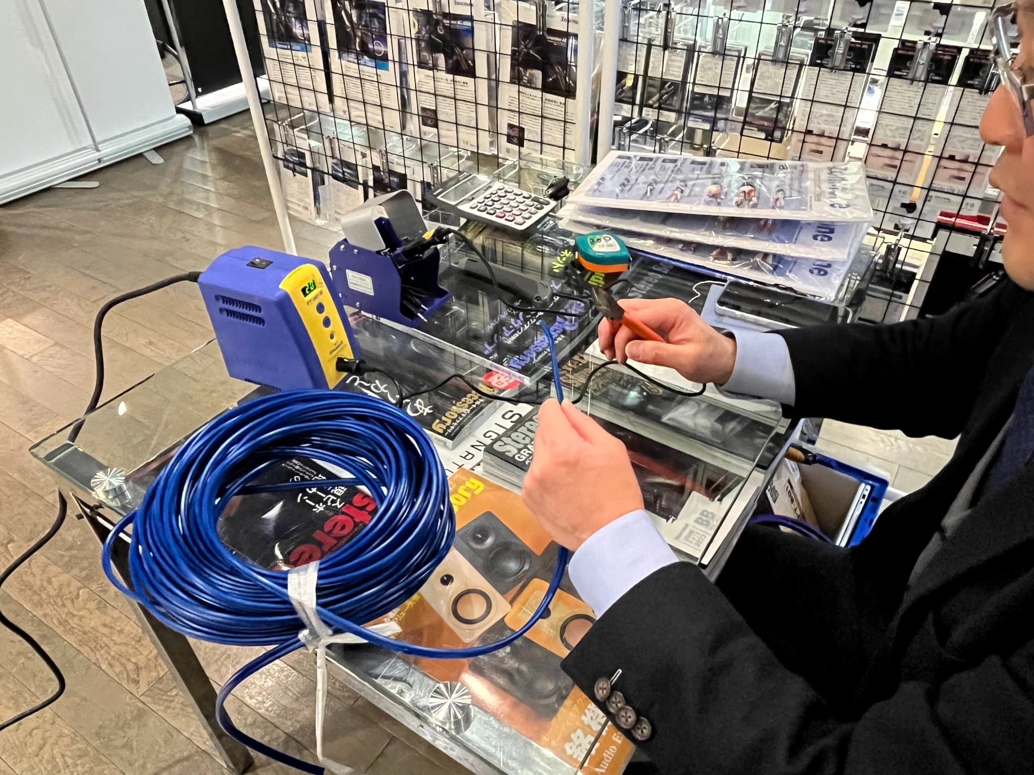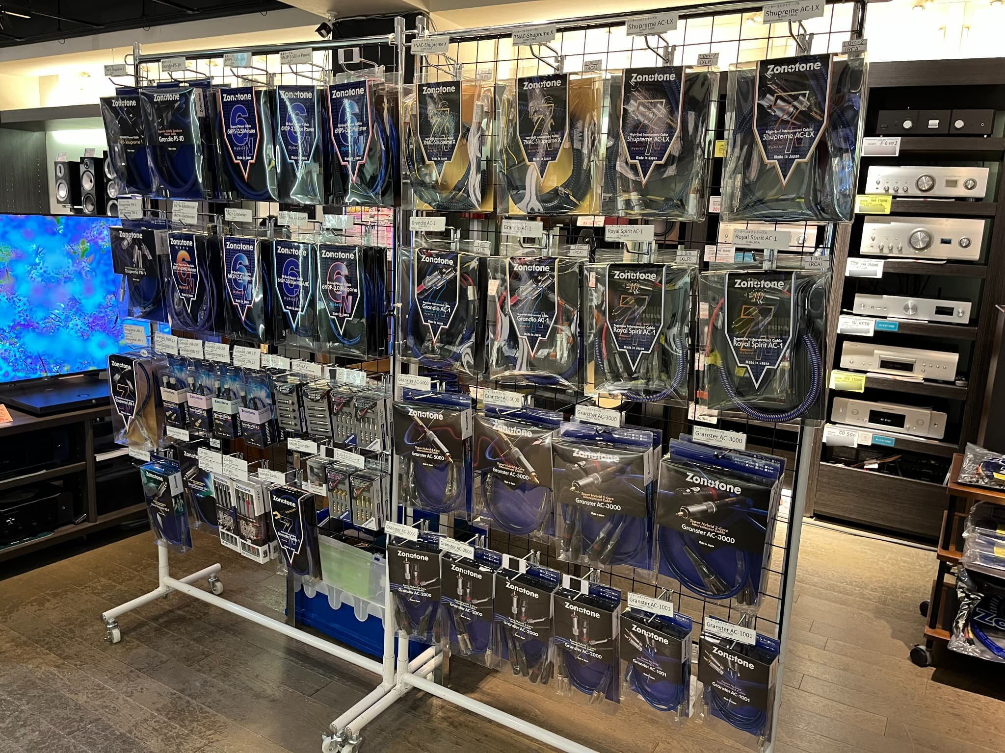Zonotone(ゾノトーン)ブースでは、様々なケーブルを販売。また、購入したケーブルをその場で端末処理してもらえるサービスもございました。試聴会では新素材“高純度無酸素銅C1011”を使用した電源ケーブル『Grandio PS-10』や、インターコネクトケーブル『Granster AC-5000』等で比較試聴を実施!!