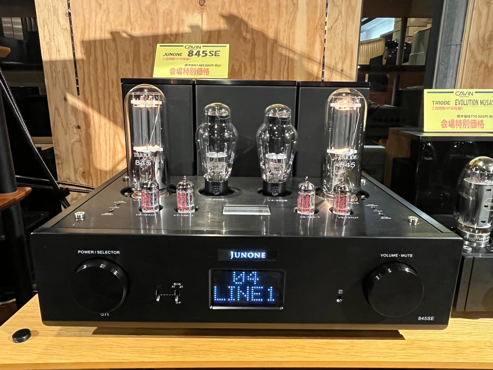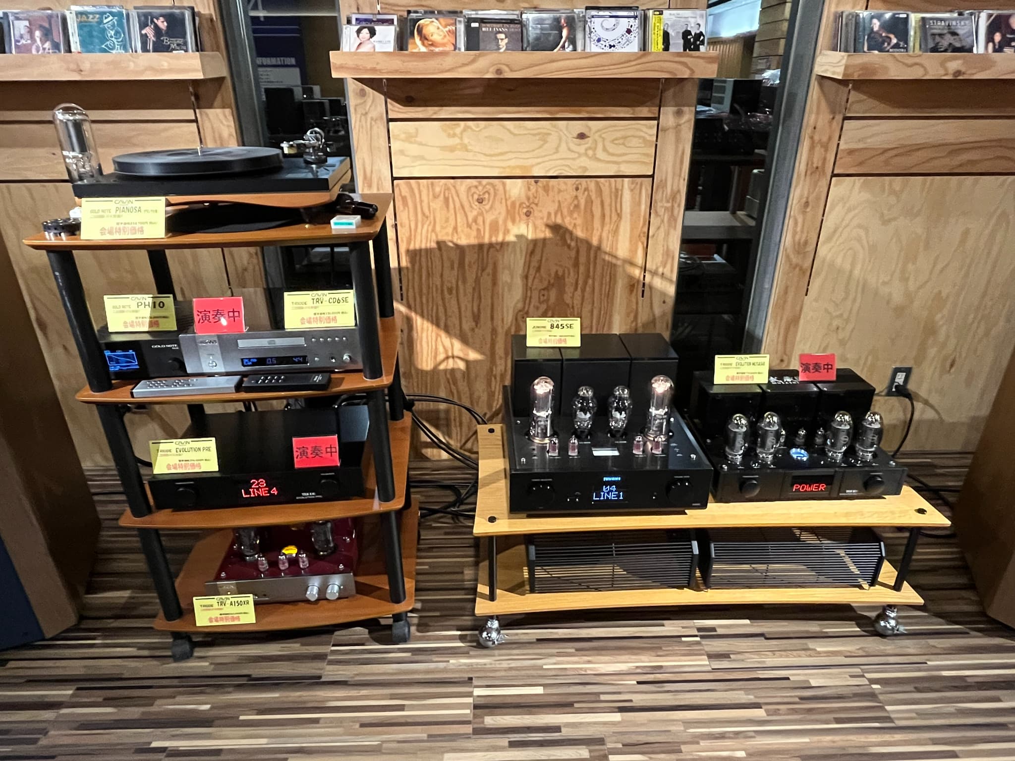 Triode(トライオード)のトップモデルの真空管プリメインアンプ、JUNONE(ジュノン)『845SE』をメインとしたシステムを展示。他にも『TRV-A150XR』『EVOLUTION MUSASHI』があり、真空管プリメインアンプ3機種で聴き比べも実施。アナログプレーヤーはGOLD NOTE(ゴールドノート)『PIANOSA(グランツ仕様)』を使用しておりました。