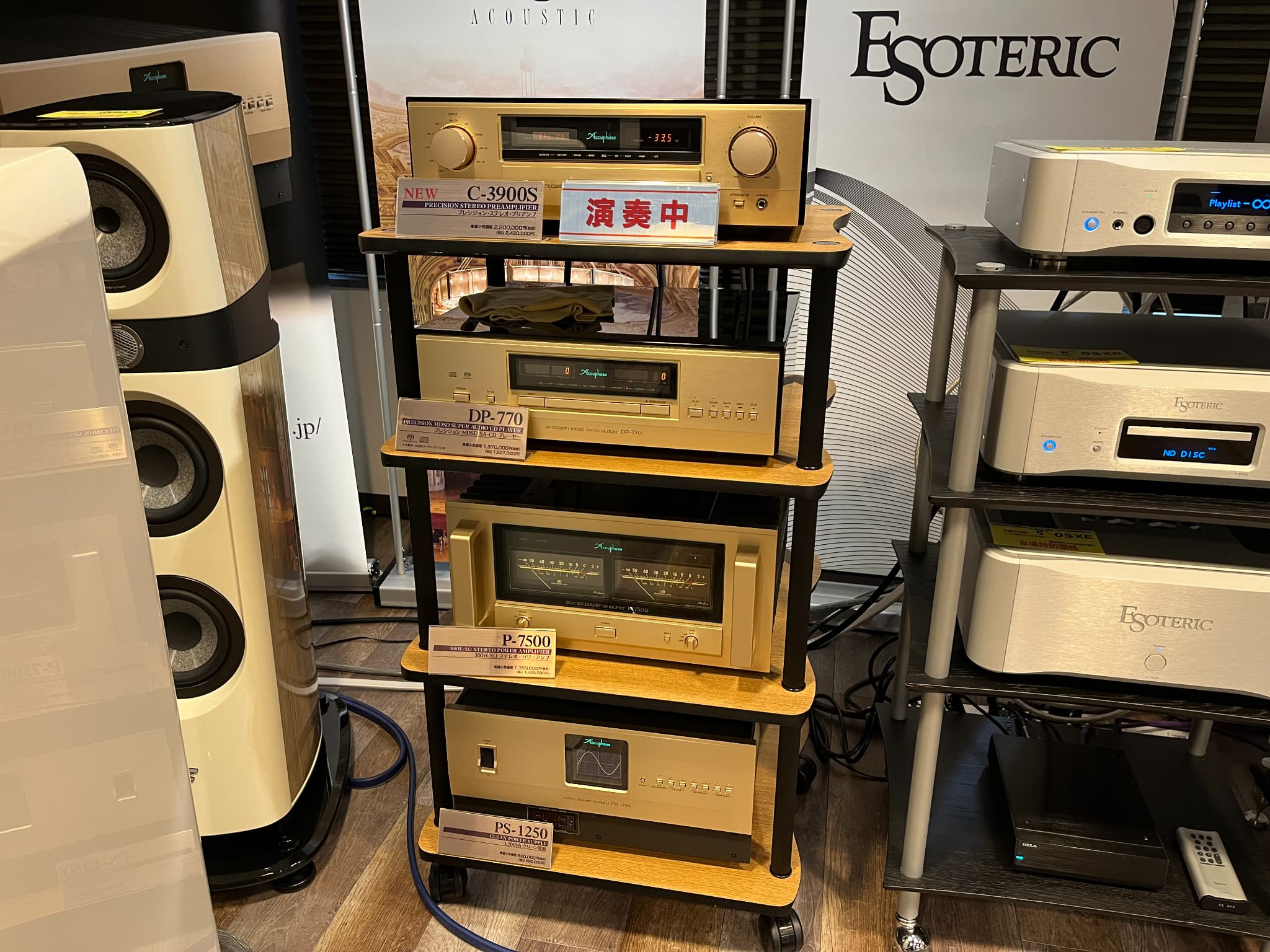 アキュフェーズ、エソテリック、TAD、ラックスマンの4社が参加し、各システムの聴き比べを実施しました。スピーカーはB&W「804D4」を使用。