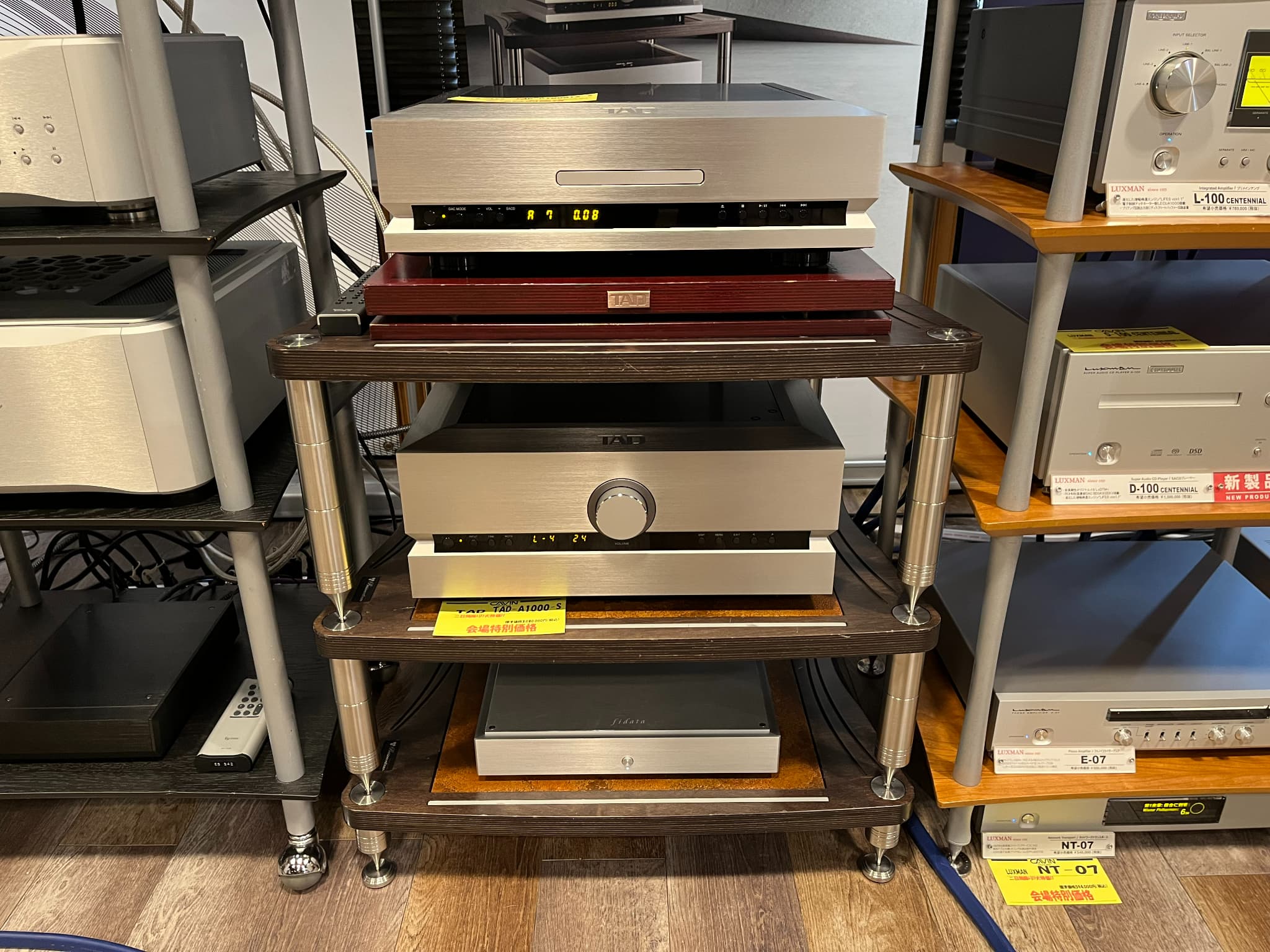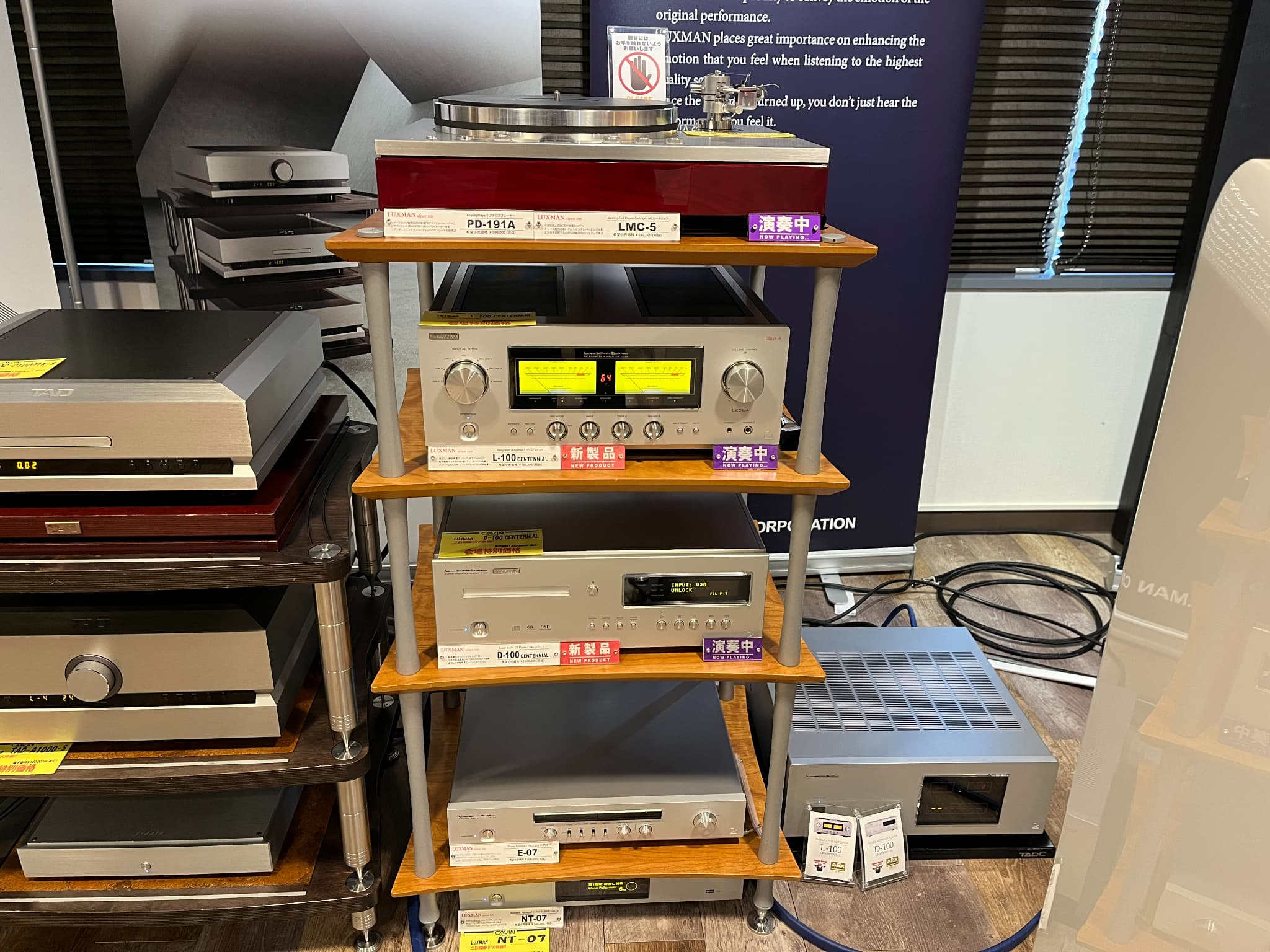 LUXMAN(ラックスマン)では同社創立100周年記念モデルのA級プリメインアンプ『L-100 CENTENNIAL』、SACD/プレーヤー『D-100 CENTENNIAL』の徹底試聴を実施。他にも、アナログプレーヤー『PD-191A』、ネットワークトランスポート『NT-07』等、がございました。