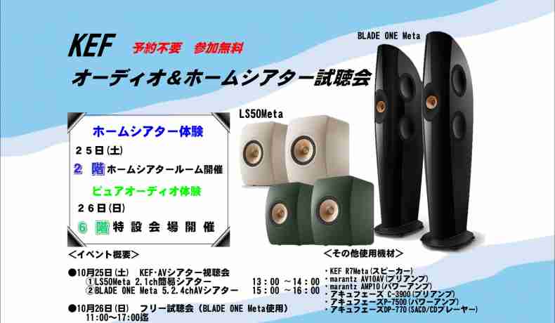 EVENT イベント情報 KEF オーディオ&ホームシアター試聴会 10.25SAT - 10.26SUN 二日間シアター/ピュアオーディオ KEFフラグシップモデル「BLADE ONE META」を使用した試聴会を開催いたします。 北海道オーディオショウ2025 10.4SAT - 10.5SUN 北海道最大のオーディオイベント!! 様々なブランドのオーディオ機器・アクセサリー等が大集結!! オーディオアクセサリーフェス 09.06SAT - 09.07SUN IsoTek、WIREWORLD、FURUTECH、TOP WING、AudioQuest、日本音響の製品を比較試聴できる!! 参加無料です! 2025 夏の展示品・中古品処分セール!! 中古品・展示品と、お買得商品が目白押し!!中古盤CDセールも掲載!! UESUGI & DS AUDIO試聴会 08.23SAT - 08.24SUN 真空管アンプでお馴染みの上杉研究所&光カートリッジで話題のDS AUDIOが夢のコラボ!! ニセコ オーディオフェア 08.02SAT - 08.03SUN 人気オーディオメーカーが多数参加し、オーディオ機器の展示・試聴会を実施!! オーディオ&ホームシアター試聴即売会2025 06.07SAT - 06.08SUN 話題の商品を実際に聴けて、お得に買えちゃう大イベント!!今年は29社が参加!! 新製品Grandioso N1Tで聴くKlipsch試聴商談会 05.17SAT - 05.18SUN 5月17日(土)、18日(日)の2日間、6階特設会場にて開催!! Klipschスピーカー3機種が試聴可能です!! SAEC 新製品トーンアーム徹底試聴とアクセサリー各種で変わる音質体感 03.29SAT - 03.30SUN 3月29日(土)、30日(日)開催。注目の新トーンアーム、カートリッジ、アクセサリー各種を試聴できます!! 旭川オーディオ試聴即売会 03.22SAT - 03.23SUN 2日間限定!! イオンモール旭川駅前店にて開催します!! スフォルツァート ネットワーク&ストリーミング試聴会 03.15SAT - 03.16SUN 3月15日(土)、16日(日)の2日間開催!ネットワークオーディオを楽しんでいる方、興味のある方必見です! TAD新製品試聴会 03.08SAT - 03.09SUN 3月8日(土)、9日(日)の2日間、6階特設会場にてTADの新スピーカー『TAD-ME1TX』が試聴できます!! JVC 8K PREMIUM鑑定団 02.11Tue DLA-V900Rが「第40回HiViグランプリ、ゴールド・アウォード」を受賞されたことを記念し8K PREMIUM鑑定団を開催します。 年に一度の決算売り尽くし 2025 - 02.20thu オーディオ・ホームシアター製品を安く買うなら今がチャンス!! 2025年「初売SALE」開催! 01.04SAT - 01.05SUN あけましておめでとうございます!! 新年のお楽しみ『初売SALE』開催します!! 新製品 世界最小ネイティブ4Kレーザープロジェクター 「DLA-Z5・DLA-Z7」視聴会 11.30SAT Victor最新プロジェクター「DLA-Z7/Z5」の視聴会を開催します。 2024 歳末週替わりイベント 11.30SAT - 12.22SUN 様々な試聴イベントを開催!!話題の最新機種が大集合!! JBL(ジェイビーエル) MA9100HP+ステージ2シリーズ視聴会 11.16SAT - 11.17SUN 11月16日(土)17日(日) 2日間にわたりJBL新AVアンプと新スピーカーをご堪能いたけます。 ELECTROCOMPANIET&JORMA DESIGN試聴会 11.02SAT - 11.03SUN 11月2日(土)、3日(日)の2日間、6階特設会場にて開催。 ハイエンド機器や、アクセサリーが試聴できます! 2024北海道オーディオショウ 10.5SAT - 10.6SUN 皆さまお待ちかね!!新製品や国内初披露の商品等が試聴出来る大イベントを今年も開催!! KOJO TECHNOLOGY/PERFECTIONアクセサリー試聴会 09.14SAT - 09.15SUN オーディオアクセサリーの効果がよく分かる!期待の新製品も登場! 苫小牧オーディオ体験&相談フェア 08.31SAT - 09.1SUN 苫小牧COCOTOMA(ココトマ)にて2日間開催。オーディオとは何かを分かりやすく解説します!! 夏の展示品・中古品処分セール!! お買得商品が目白押し!!中古盤CDセールも掲載!! YUKISEIMITSU AUDIO『AP-01』アナログプレーヤーを試聴する 04.27SAT なんと、講師にオーディオ評論家・小原由夫 氏と、由紀精密株式会社・永松純 氏をお招きします!! Victor 新商品Debut特別視聴会 7.13SAT 2024年5月22日に発売されたDLA-V900R/800Rの道内初視聴会を開催いたします。 釧路オーディオ試聴即売会 03.30SAT - 03.31SUN 昨年に続き釧路ロイヤルインにて開催!!お買い得商品が多数!! オルトフォンMM/MCカートリッジ祭り!! 02.24SAT - 02.25SUN 現在発売中の全ラインナップ中、なんと…約8割のモデルが試聴できちゃう!!お見逃しなく!! DS Audio 試聴会 03.16SAT - 03.17SUN MM型でも、MC型でもない “光カートリッジ” 試聴してみませんか!? アイレックス試聴会 04.13SAT - 04.14SUN 4月13日(土)、14日(日)の2日間、6階特設会場にて開催。多数のブランド、メーカーの商品を試聴できます!! オーディオ&ホームシアター試聴即売会2024 06.01SAT - 06.02SUN 話題の商品を実際に聴けて、お得に買えちゃう大イベント!!今年は28社が参加!! 100万円オーバーのプリメインアンプの実力を探る!! 05.21TUE - 06.16SUN 各メーカーのプリメインアンプを比較試聴しませんか!? 2024年「新春初売SALE」開催! 1.4THU - 1.5FRI 新年はお得にお買い物しちゃおう!!今年もやります!「スピードくじ」「中古CD福袋」!! ESOTERIC Grandioso SEで聴く『Avantgarde G3 』新商品試聴会 02.03SAT - 02.04SUN 新スピーカー『G3 UNO SD』を中心に、TANNOYの新スピーカー『Stirling III LZ』などをお聴きいただけます!! 年に一度の決算売り尽くし!!2024 ~ 02.20TUE 皆さまお待ちかね!!お買い得商品が目白押し!! YAMAHA プレミアムスピーカー「NS-800A 
