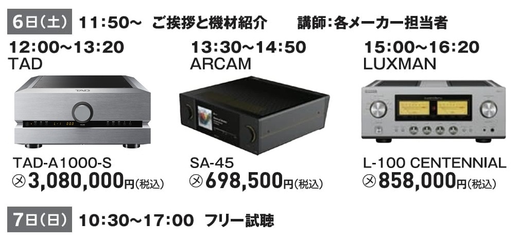 | スケジュール | ・12月6日(土) 試聴会12:00~13:20 TAD 13:30~14:50 ARCAM 15:00~16:20 LUXMAN ・12月7日(日) フリー試聴10:30~17:00 |