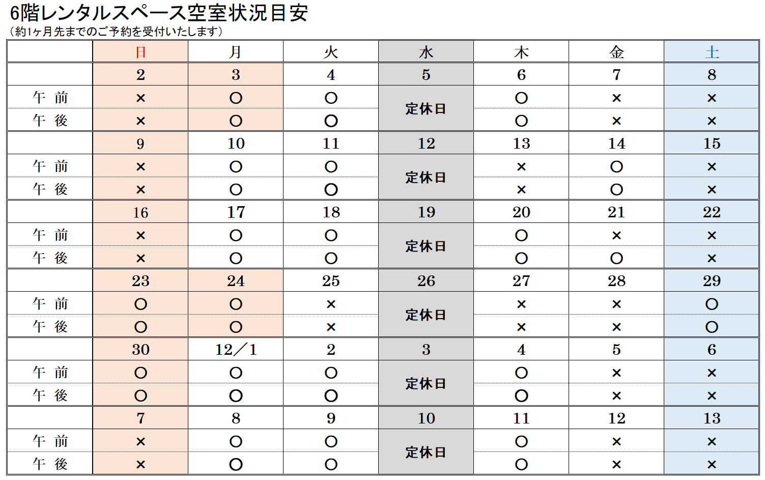 凡例 ○=空 ×=ご利用不可 △=要相談/午前=11:00~13:00 午後=13:00~18:00/掲載日以降の状況はお問い合せください。